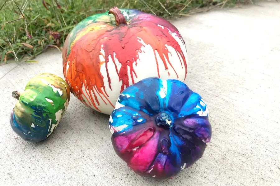 This fall & Halloween, let the kids get crafty and create colorful pumpkins covered with melted crayon wax. This project is super easy, and can get a little messy - so kids will LOVE it. Not only is this project a great excuse to decorate some pumpkins, you can use the activity to teach small children about the rainbow, "ROYGBIV," the color wheel, and even discuss analogous and complementary color schemes with older kids.