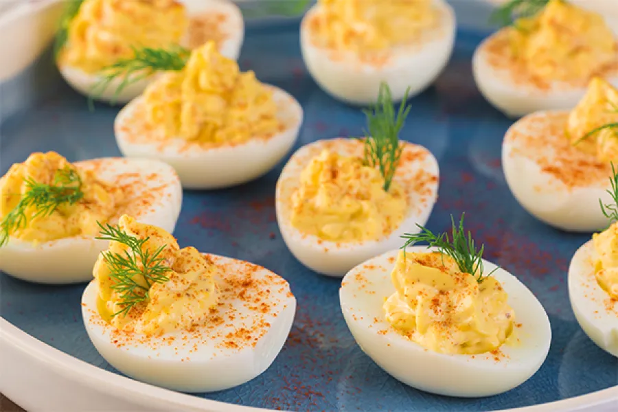 - Once the eggs are cool, peel and cut them in half, lengthwise. Remove the yolk and place it in a mixing bowl. Set the egg halves on a serving platter.